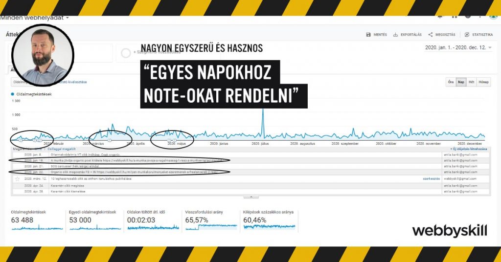 Például így jöttem rá arra is, hogy az Analytics-ben a chartra lehet az egyes napokhoz note-okat rendelni, és van olyan ügyfél, ahol használtuk, hogy na ezen a napon, vagy főleg mondjuk saját projekteknél, ahol nagyon akartuk látni a mérést. Ezen a napon kiment egy blogcikk, ezen a napon…