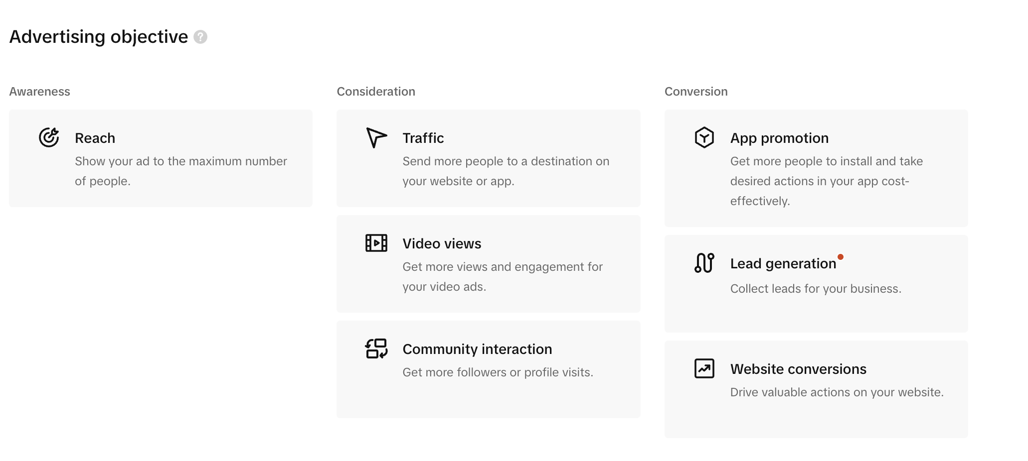 Válaszd ki a kampánycélod! Ilyen lehet a forgalmad növelése, a márkád ismertebbé tétele vagy az alkalmazásod letöltése. A TikTok alapértelmezetten “traffic” típusú hirdetést javasol, ám ez csak weboldal-forgalmat fog generálni. Ha inkább termékeladásra törekszel, akkor a “conversion” kampánytípust kell kiválasztanod.