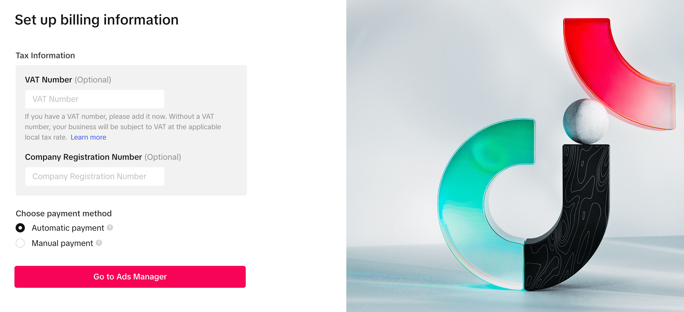 Kiválaszthatod azt is, automatikusan vagy manuálisan fizetnél a hirdetésekért. Jó tudnod, hogy ez nem a hirdetési felület fix díja! Ilyet a TikTok nem számít fel, csak a már beállított kampányaid költségeit számlázza ki neked. Ha az automatikus fizetést választod, akkor hetente vagy havonta le is vonja a pénzt a számládról.