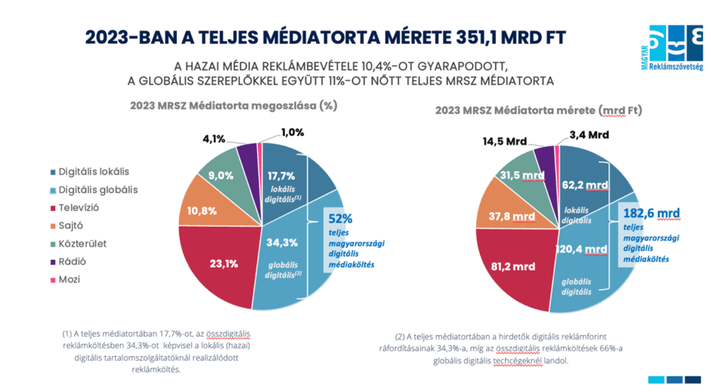 A részletesebb válasz sem lesz bonyolult: alapvetően nem tudsz elmenni amellett, hogy 2023-as adatok szerint a több mint 351 mrd-os magyar médiatortában a szereplők reklámbevételeinek 52 százaléka már a digitális felületeken keletkezik. (Forrás: DIMSZ)