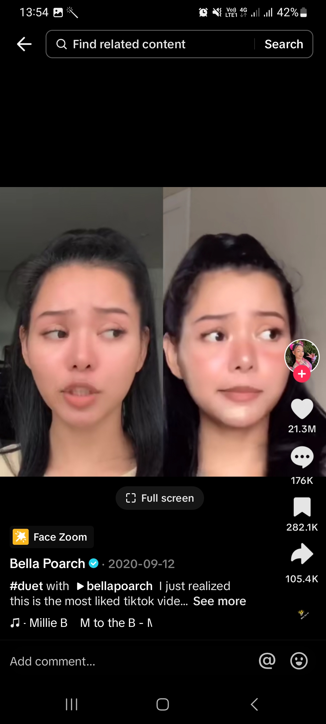 Ha duettet szeretnél létrehozni videóval, koppints a videó jobb oldalán lévő Megosztás gombra, majd a Duett lehetőségre. Ne feledd, hogy a felhasználóknak bele kell egyezniük ebbe, így nem biztos, hogy minden videóval duettezhetsz.